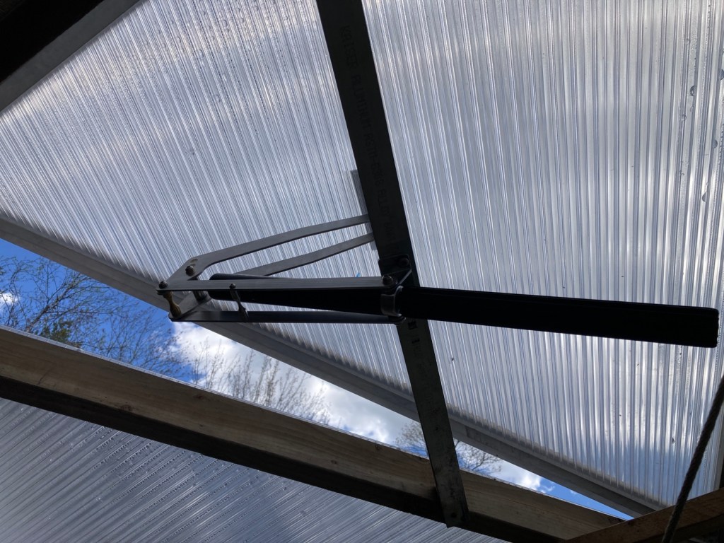 Only recently has it been hot enough to need venting on the top. (One can’t say “roof” in regards to a geodesic dome as the vast majority of it is!!). Clambering up and down, lodging logs under the vents (and reversing the process in the evening), effective yes, overly cumbersome, absolutely!