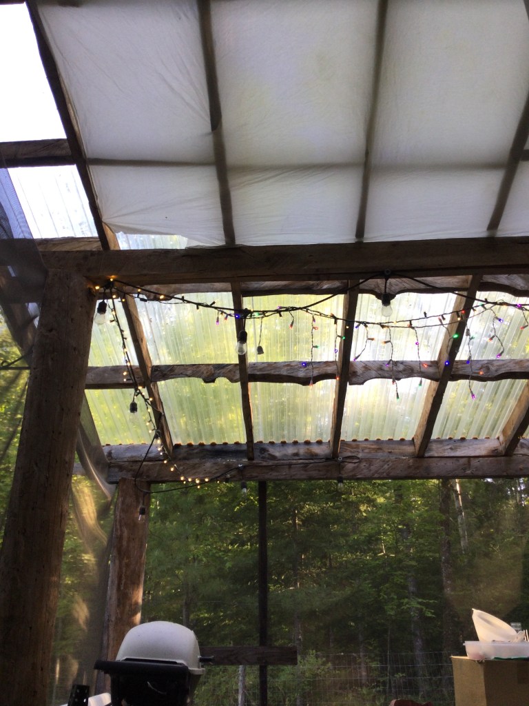 On a variety of things. Upstairs became a mere depository for cloth, clothing, bedding, and a few too many odds and ends. I’m working on it up there, came across a sheet I won’t be using, utilized it as a new shade cloth. Two birds, one stone…