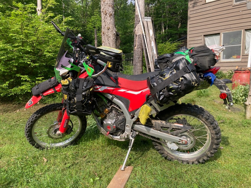 Switching wallet from road suit to dirt suit. Got snacks and electrolytes, rain coat. Tent and bedding if the spirit moves me, us…