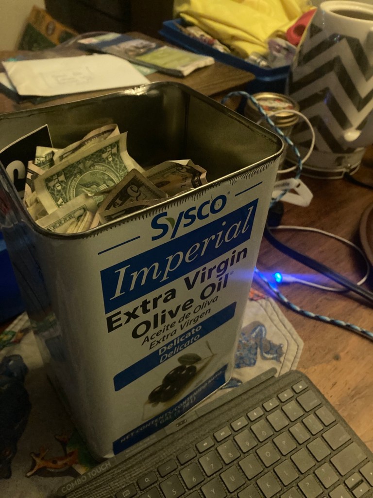 All summer I’ve been depositing my cash tips into the same place, a gallon olive oil can without the top.