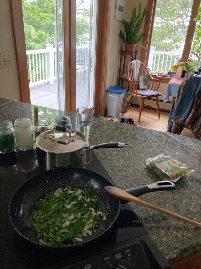 At the stove in Round Pond, breakfast veggies and protein.