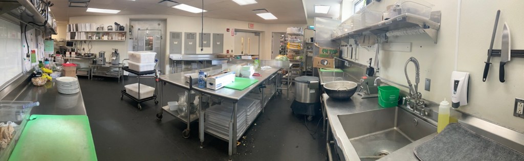 From the hand washing station. Entrance is to the left, table with cooktops and mixers, walk-in (our own, there are several!!), work table and then exit. Dry goods in the middle back, LOTS of staff come and go throughout the day. The dressing fridge (we make all our own from scratch, several options available per meal) and the washing/spinning station coming around to the right, and the sharps sink.