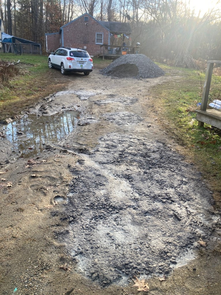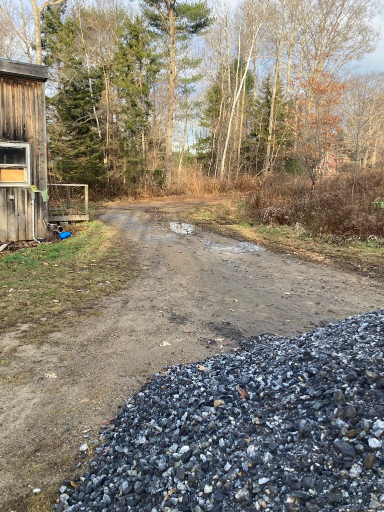The gravel pile isn’t close, but it’s not in the way. The goal was to get exercise, the bonus is a better driveway! Working the gravel down into the mud ensures a proper connection, lasting fill