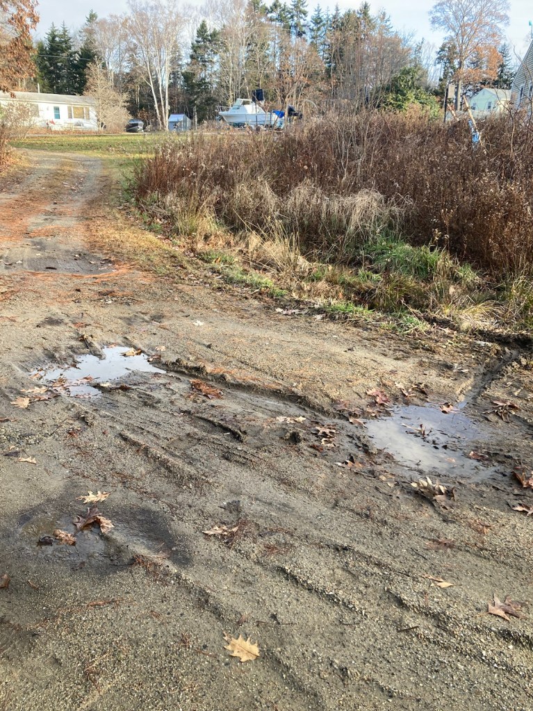 I didn’t think I would get the nearest right puddle filled, but just went shovel full at a time. I drained the big puddle on the left, and the right puddle into that. Key is getting water off the road…