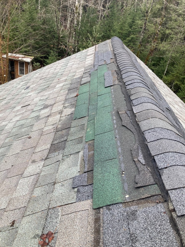 The fix will suffice, get the house through winter. The ridge vent and shingles predate the roofing job (I was living on Peaks at the time, went to Sue Putnam’s funeral en route to the project, ten something years ago if not more!). Those shingles were a handlmedown or something, now brittle and failing…