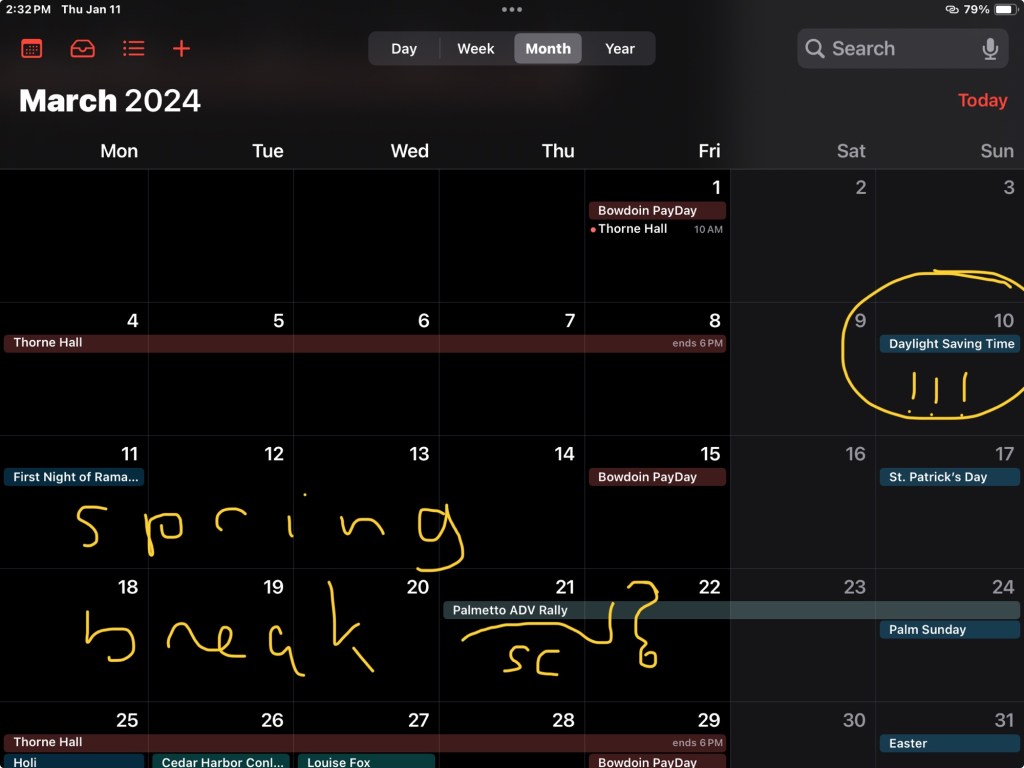 That daylight savings time kicks in just as spring break begins. It’ll be too early to ride locally. There is an ADV (Adventure Biking) rally outside Charleston SC the second weekend of break. It’s tempting, but as I’m not into groups, group rides, I’m keeping that in mind, “ponder mode.” (If the tickets sell out, oh well…)