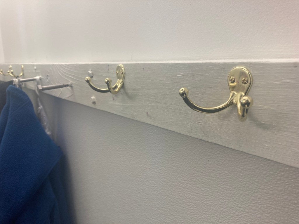 I took it upon myself to deploy some hooks in our back door foyer. Some folks have noticed, some haven’t. Those that have are grateful, we have room to hang things like walk-in layers and now extra outdoor layers.