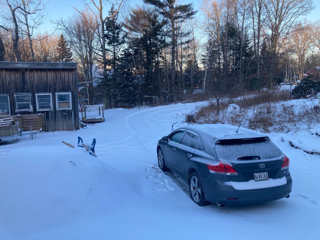 Well it’s back, and here for a week at least…. Made some Venza discoveries on the way home. It does well in the snow, I didn’t push the limits, but it’s very sure footed. The defroster splays out from the middle of the dash, not ideal. The edges of the windshield were freezing up. It’s a very big window, at quite the angle. Further assessment required.