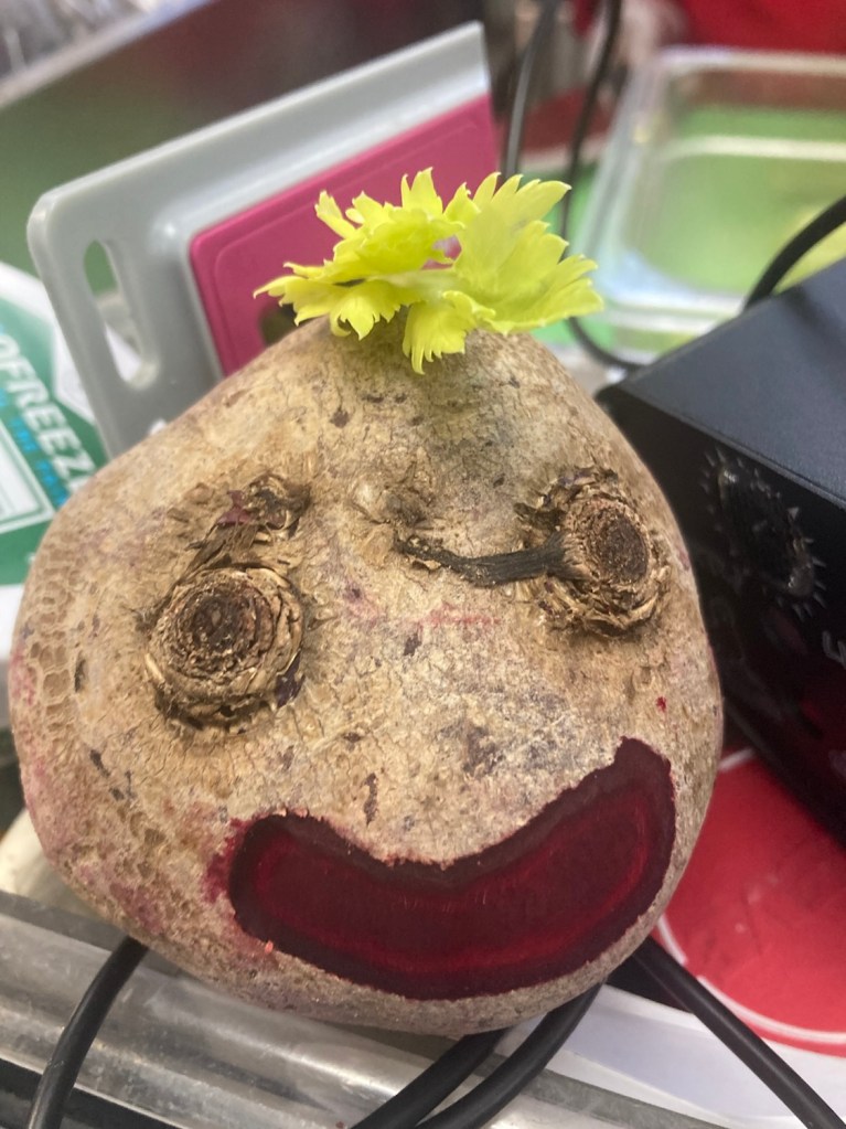 It brought some smiles to coworkers. The celery mohawk turned into a little carrot (top) beret, no photo of that…