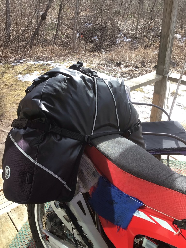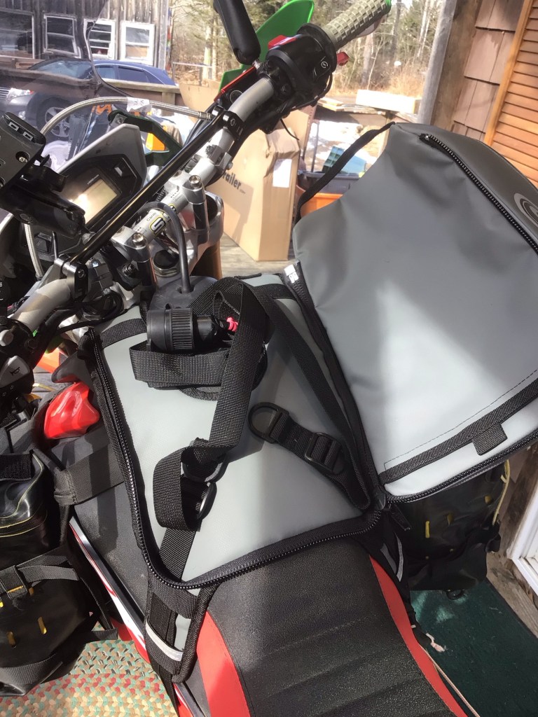 It’s obvious when gear is constructed by fellow riders. This “bag” is sometimes referred to as “horseshoe shaped”, or a pair of pants/shorts. Both make sense, are accurate. The latter works for me and helps explain why it works so well on the bike. It fits on the bike more like a passenger than luggage, snug, low, stays put.