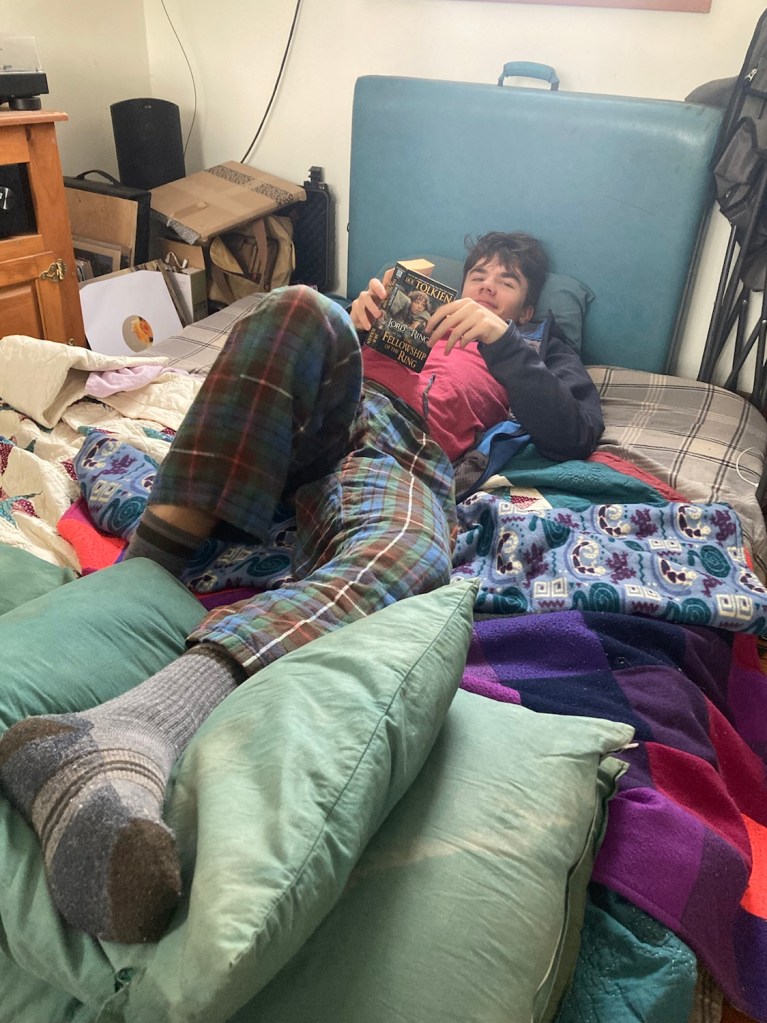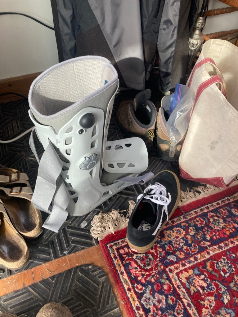 With ankle elevated, he’s doing some reading (and will get on his phone after I exit the building). I need some fresh air, won’t be gone long, but a quick step out before we tackle lunch.