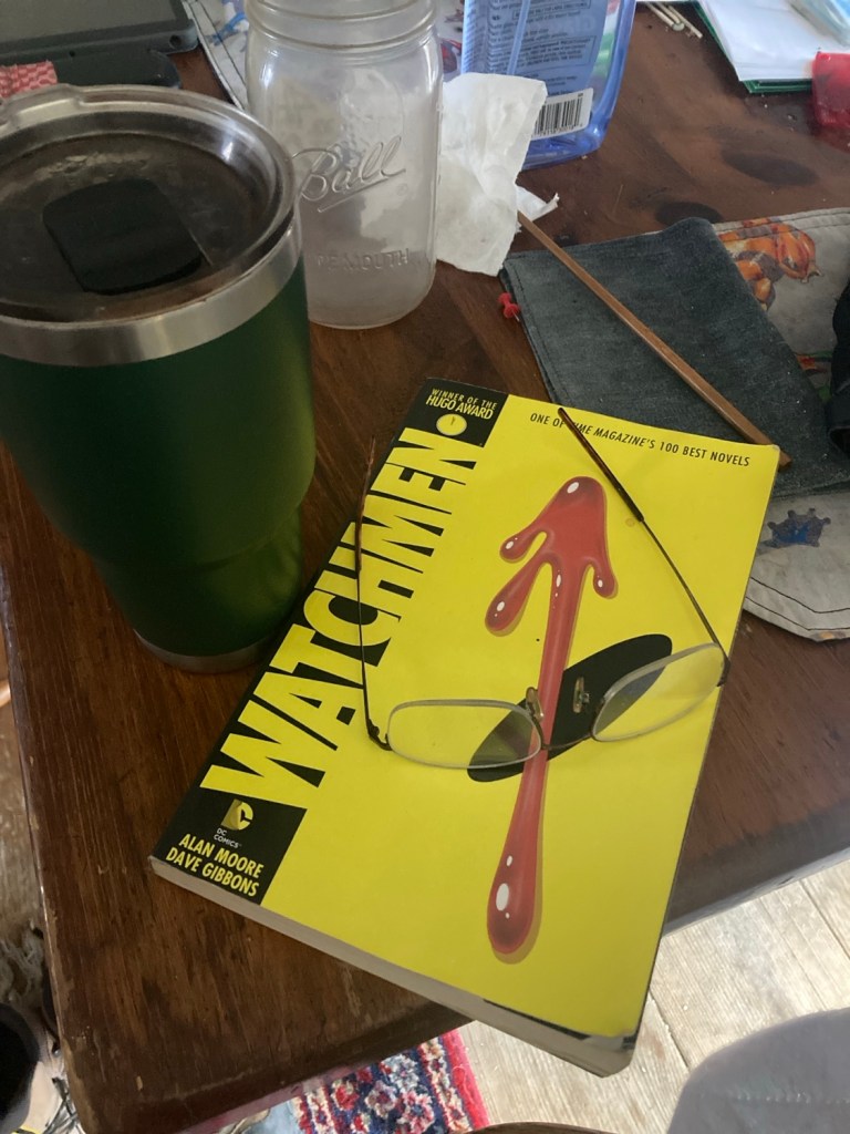 I’m pecking away at a graphic novel. It’s an omnibus, all Watchmen comic books under one cover. I discovered the movie a few years back. Had to watch it two nights on a row to validate what I saw.