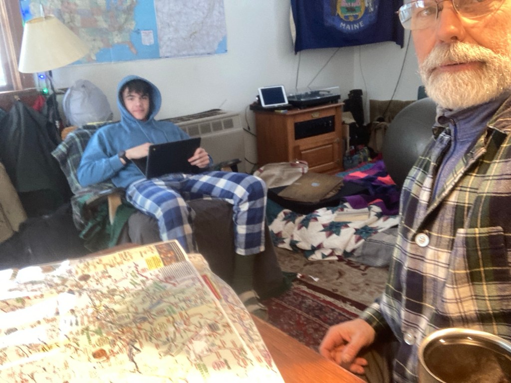 Deedles is doing some homework, I’m pouring over asphalt motorcycle maps. Eating some rich foods (tweaking the “cleanse” and exploring, experimenting…)