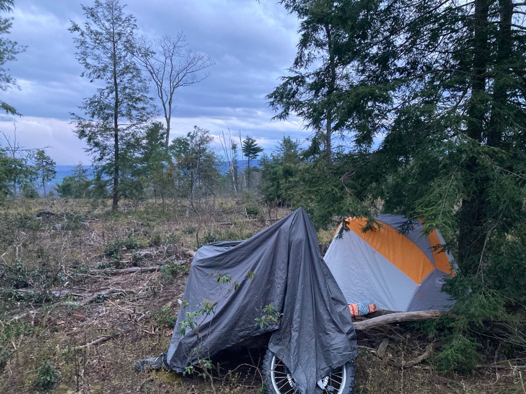 Left Williamsport late afternoon and the asphalt got narrower and narrower, crossed the river in Lockhaven and to head south(ish) and crushed some gravel road miles. I snuck off the road to the edge of a cut and set up before dark, barely.