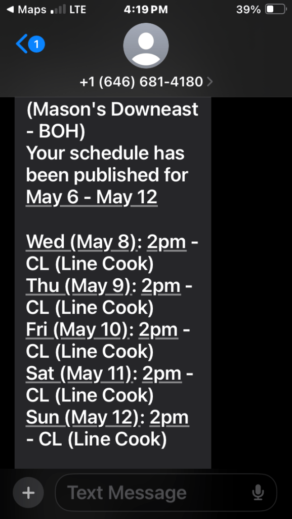 This text comes from an app called 7shifts. Never heard of it let alone used it, but it’s part of the modern kitchen world. I see my shifts, other’s, in details from position to timing. App looks like this (but not showing you others for privacy reasons)