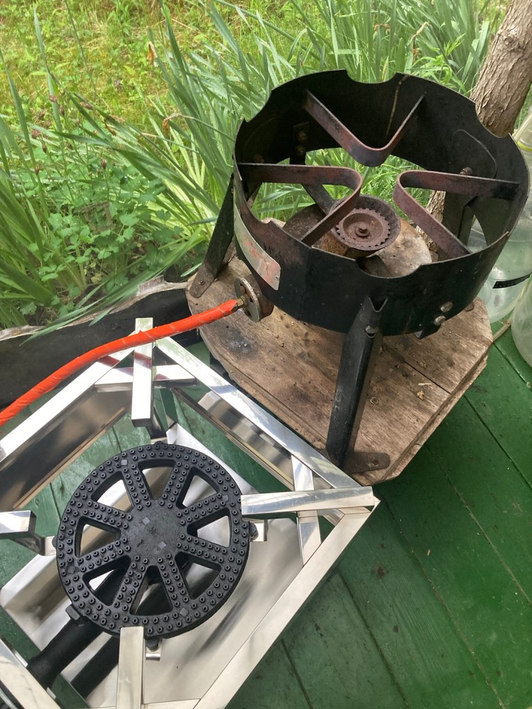 I did some research and pulled the trigger on a stainless steel cooker/burner. The gap in the middle over the burner means I’ll have to use a grate or grill or something, but wow, the burner is monstrous! the distance to the Brent is actually bigger, but the flame spread/pattern/SIZE will make up for it…
