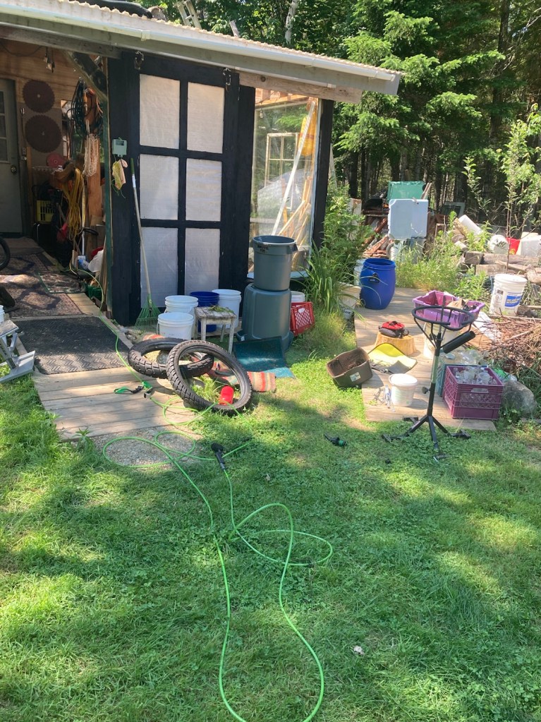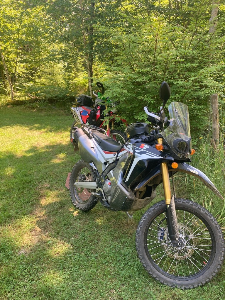 I made a bit of a mess in the front yard switching tires. We then buzzed up to Grand Lake Stream, tickled to find non-ethanol 93 fuel as both bikes needed filling