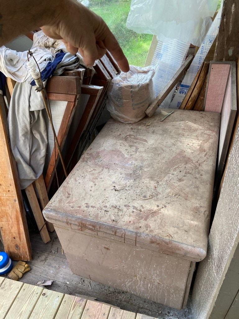 This here drawing desk is added to the Tetris game, scrap run. It’s been sorta useful in its spot, but has remained stationary since I moved out of my “Fed Ex” apartment in Auburn a few years ago. It hasn’t made it inside, so off it goes!