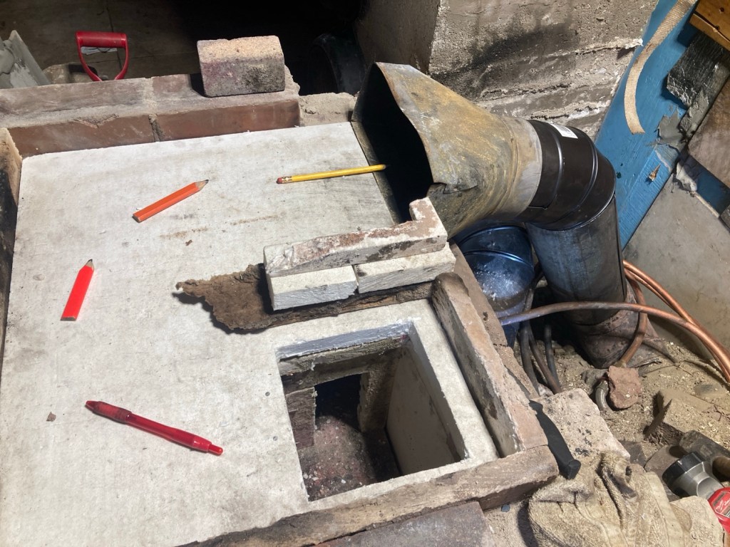 Now to create a solid level base for the stovetop. That means using brick and mortar to encircle the core (after minor deconstruction) and then use ceramic fireboard to insulate and seal it. loose fit follows