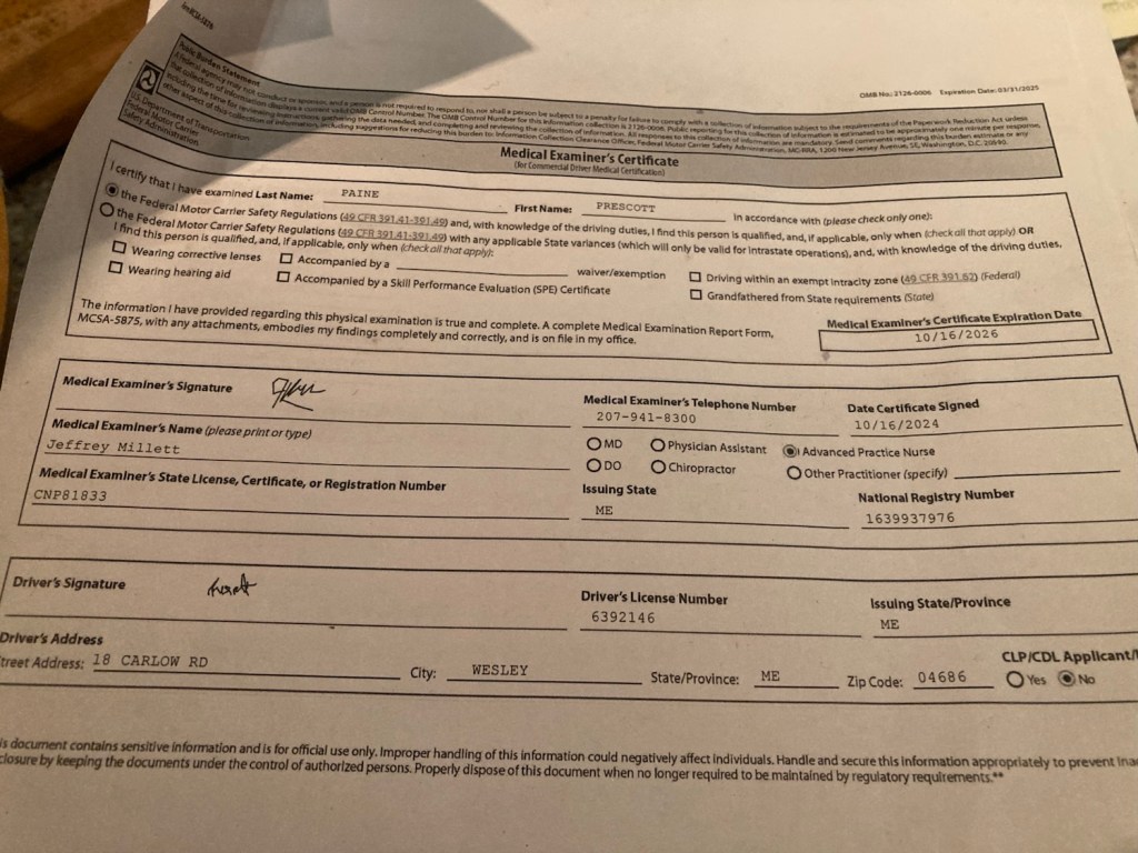 I buzzed to camp to collect important paperwork that wasn’t on my person. It’s a piece of paper, but referred to as a DOT card. To over simplify things, it means I am physically capable of driving a vehicle
