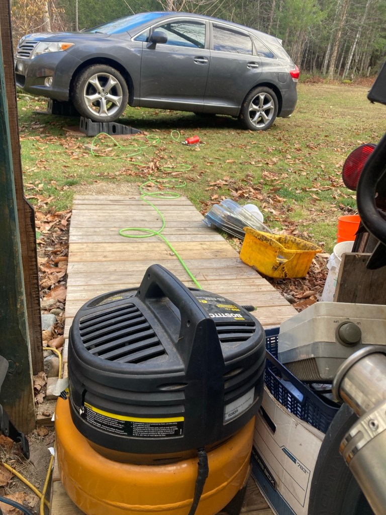 Of fluid film. I’m glad I didn’t wait to start the process. Having done a coating in the spring showed me where high wear sections are, as well as softened up some cakes of rust and protective layers (that all too often KEEP the rust in as much as they prevent it). I’m pushing my little pancake compressor, took a break for a lovely mega-lunch. (I’m eager to get the food thing sorted on Somerset, but being patient…)