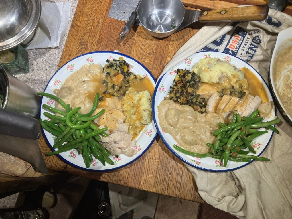 I had fun cooking on the new stove, and pulled off the turkey tenders without an oven. The gravy was chicken based, making do with what was on hand. It was fun to make, share, and eat! (Ovenless creamed onions to boot)