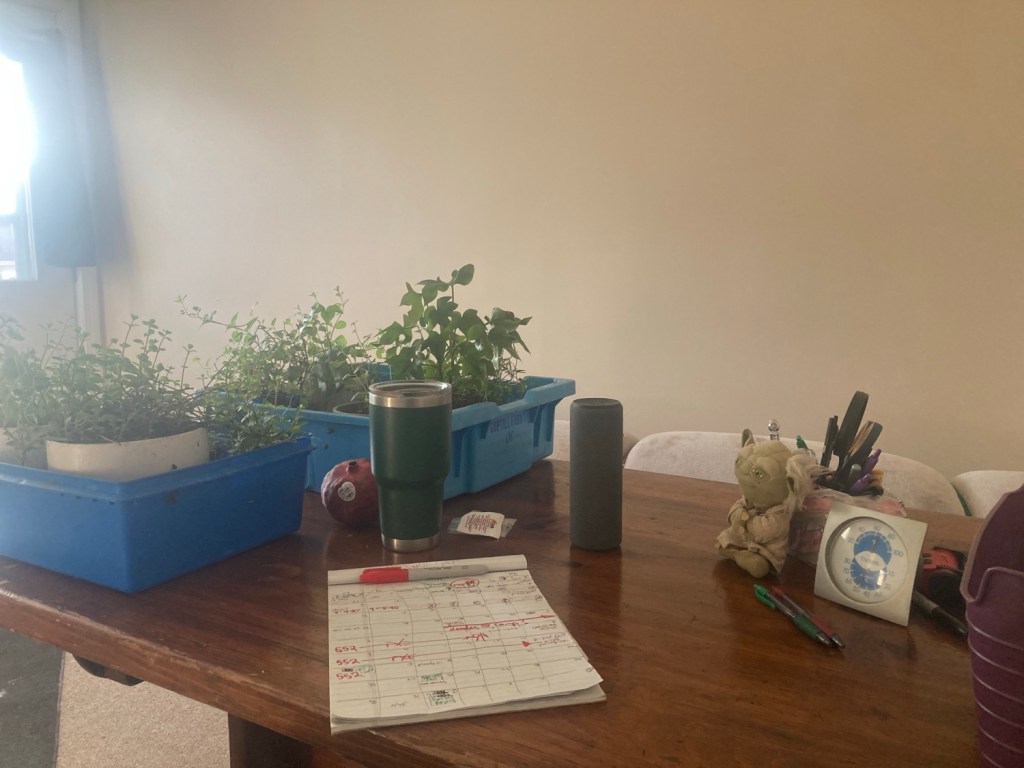 He asked me to roll the trash out, the neighbor forgot. I complied, but on return mentioned I thought he said trash day was Thursday. Even though he’s getting ready to run Wednesday errands, a friend is stopping by for a Wednesday Mac-n-Cheese pickup (with the 9 year old cheddar from a Canadian cave and homemade bread crumbs) he still thought it was trash day.