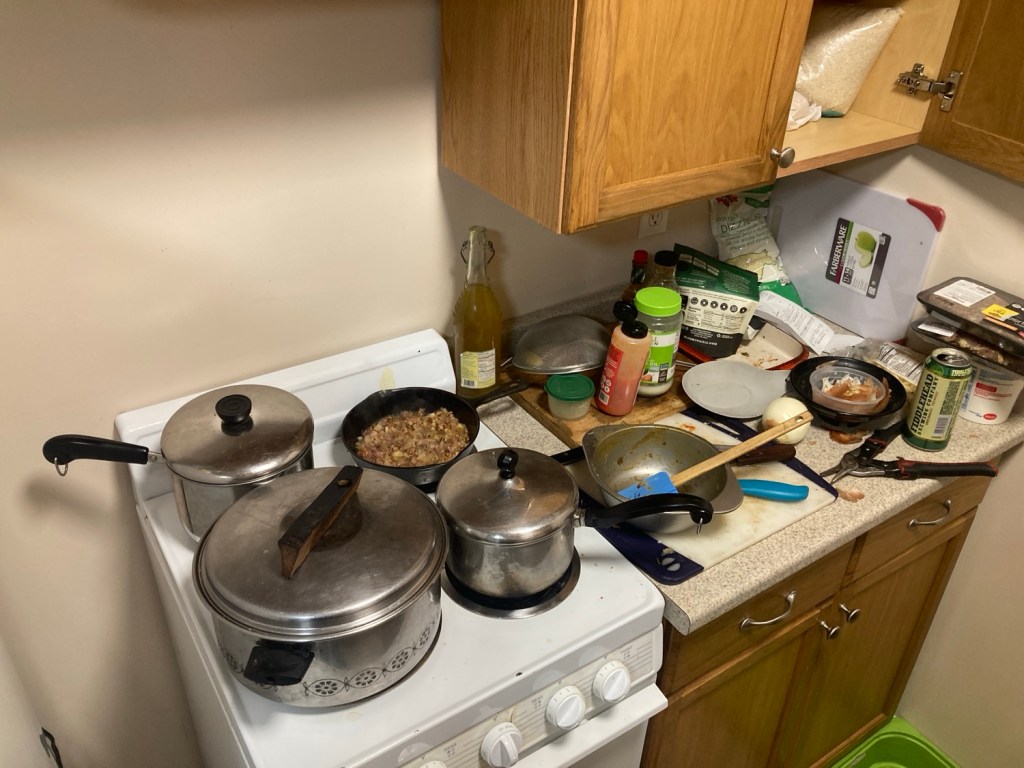 Exemplifies field expedience. I have yet to introduce a can opener to #8, testimony to how little canned food I eat. Anyhoot, it’s open and now puttanesca sauce, ready for the build
