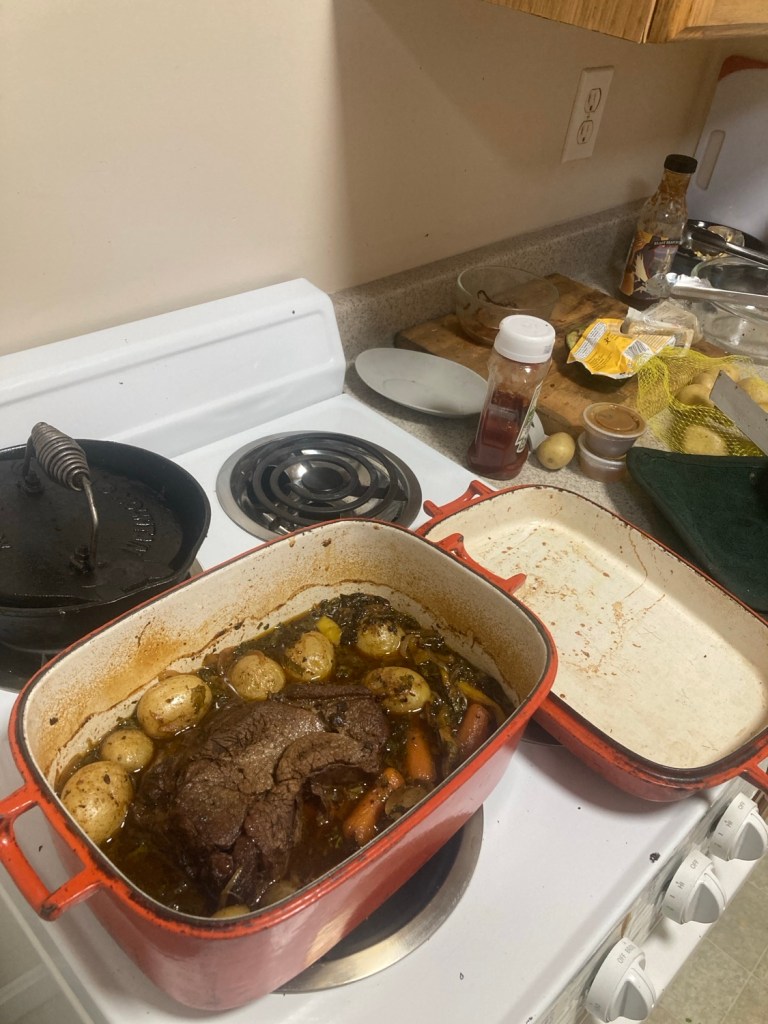 Grass fed chuck roast experiment. Seared it (gently as I was indoors and didn’t want to set off any smoke alarms) and cooked it covered, then chopped and dressed veggies for the second half.