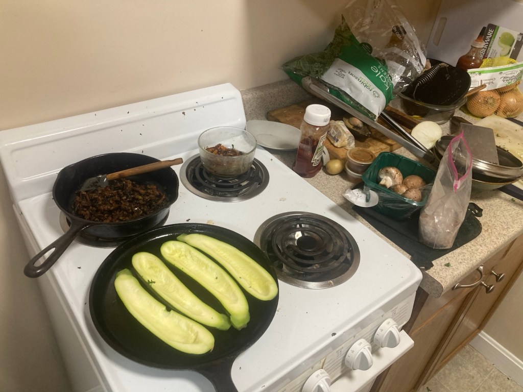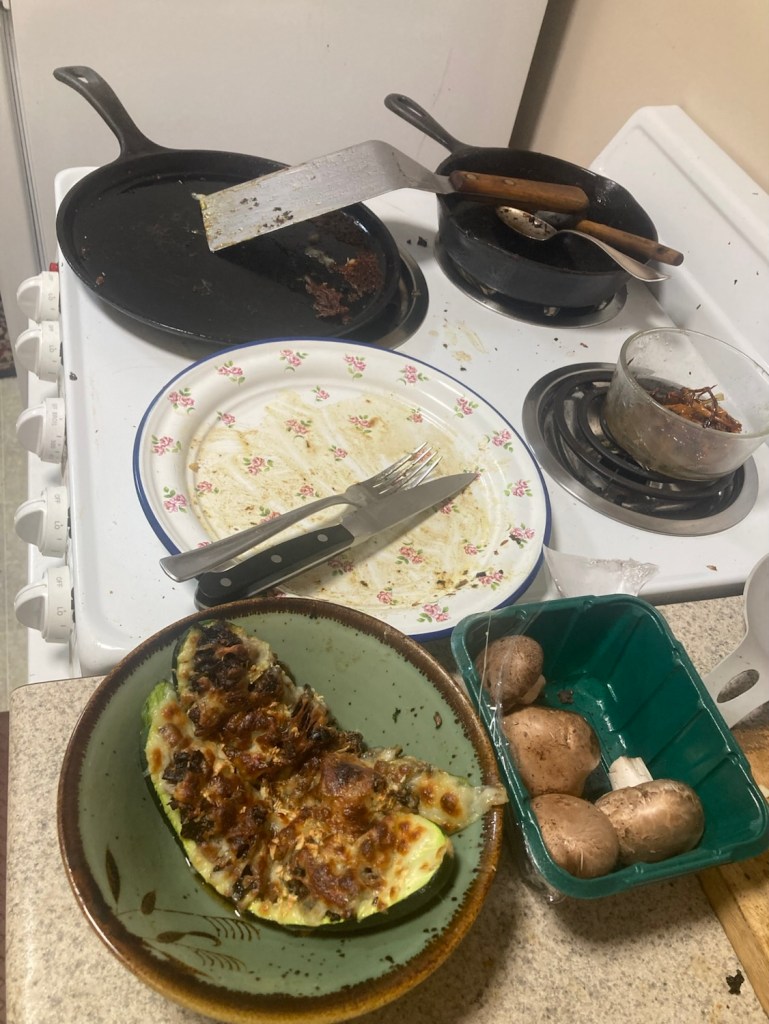 Scoop out the insides, Cook ‘em with whatever (this isn’t a food blog but I used onion kale mushroom and lamb with a literal sprinkle of Imperial IPA and spices), cover with cheese (I like fresh raw garlic on top for POP, I wanted oregano but had thyme) and with the pan AND oven cold, in for 15@250 something. A couple minutes of broil and