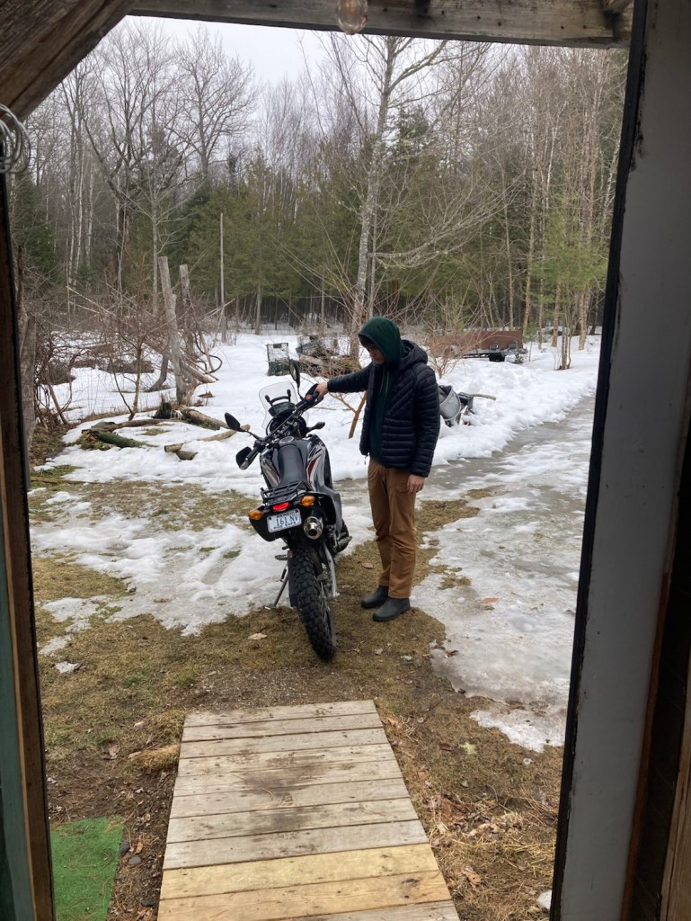 He’s not going for a ride (as the driveway is still snowed in) but “listening” to it…