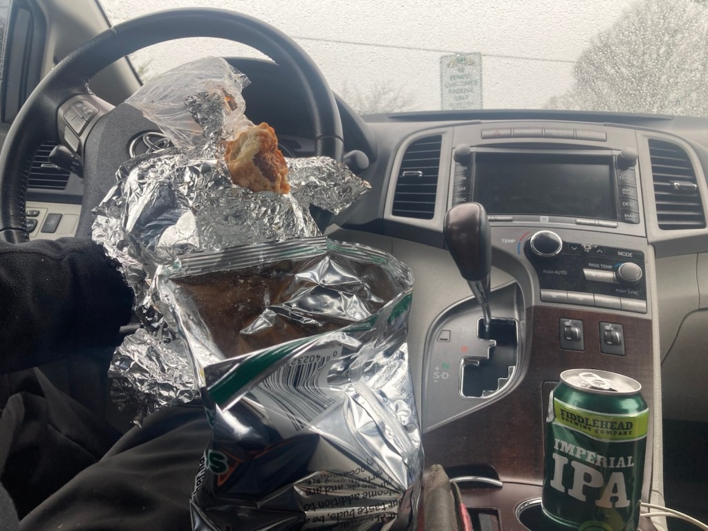 Pitstop at G&M for an Amato’s meatball sub (with some bubbly and Fox Family Potato chips from Maine!) as the snow set in. It’s not sticking (yet) and fluctuating between textures as I wrap up my snack and heading off to settle back into the apartment, the coming week. I have a hygiene session at the dentist Thursday to break up the nonroutine…