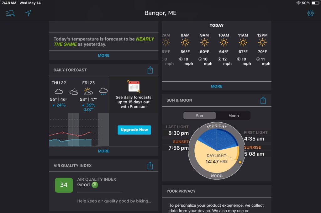 I’m not opposed to riding in rain per se, it’s one of a variety of factors that has me not riding much, at all in Bangor. Speaking of daylight, I had a “normal” delivery day and swapped out my top work layers to walk to the library. I was walking my books while most were walking their dogs…