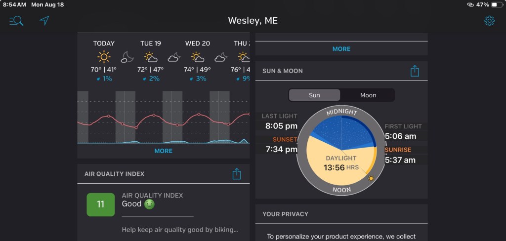 The days slowly get shorter, albeit more noticeably. The dry fresh air in the woods is astounding compared to what I left Friday. Summer is undeniably winding down, especially after observing my friends that work at and staff a seasonal restaurant. If it were closer I could help more, and considering doing some shifts, but not making any decisions right now.