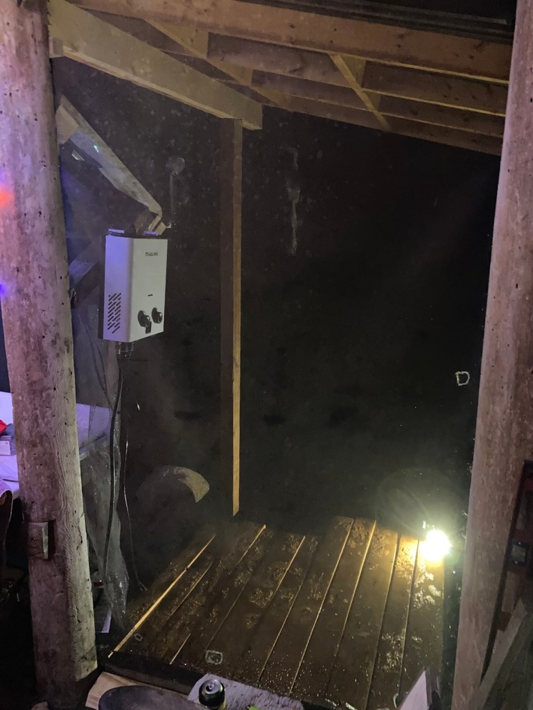 The flooring isn’t screwed down (and I’m still deciding the order of the pieces of cedar) but it worked very well, with rain water.