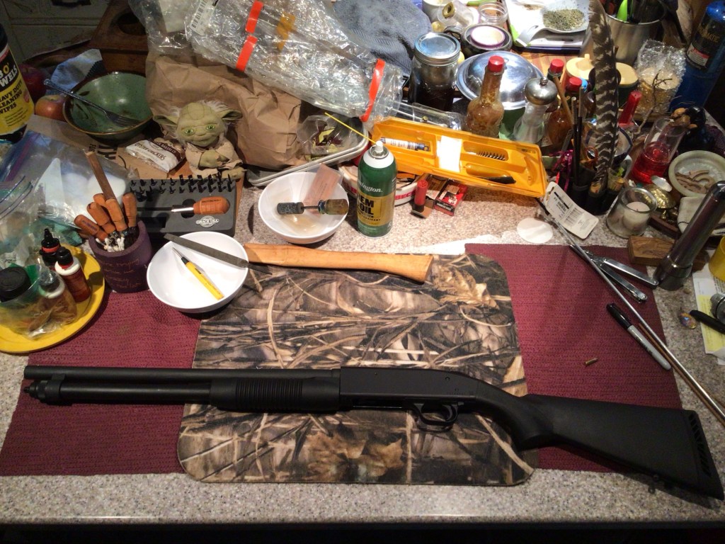 This (Mossberg model 590) 20 gauge is much more nimble and practical (in the realm of home defense). Bigger number gauge, smaller shotgun.