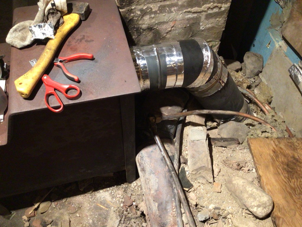 I want to scootch the stove right back to the flu. I can’t dismantle and repurpose the riserless core until the stove is securely in position