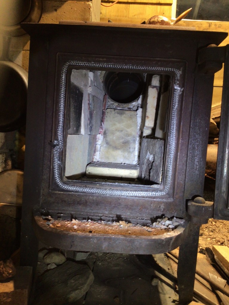 The inside of the stove is now lined with two layers of ceramic fiberboard (quite the puzzling exercise!) and some firebrick to help it stay in place, protect it.
