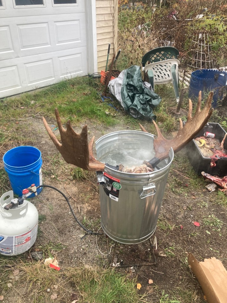 These folks are NOT making soup! They are making a mount, and removing the tissue from the skull. It takes a while…