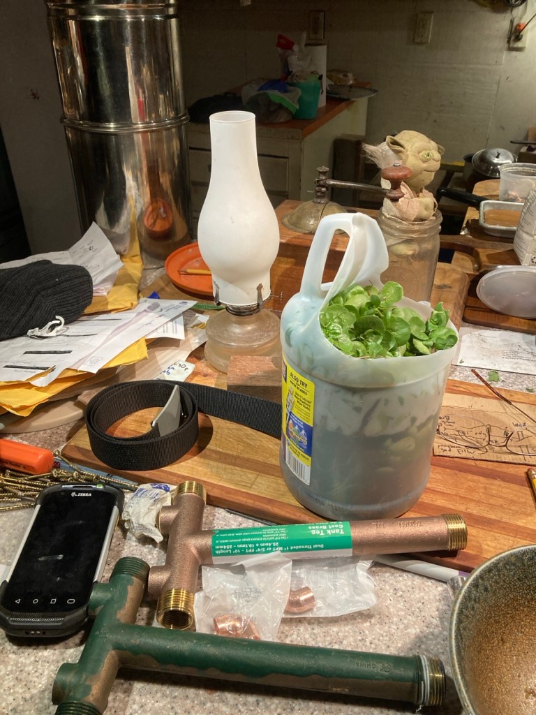 I’m exhausted, but of course I’m about to dive into some plumbing. I grabbed an aquatic plant from the spring, I think it’s watercress. See if it will take in the grome water element.