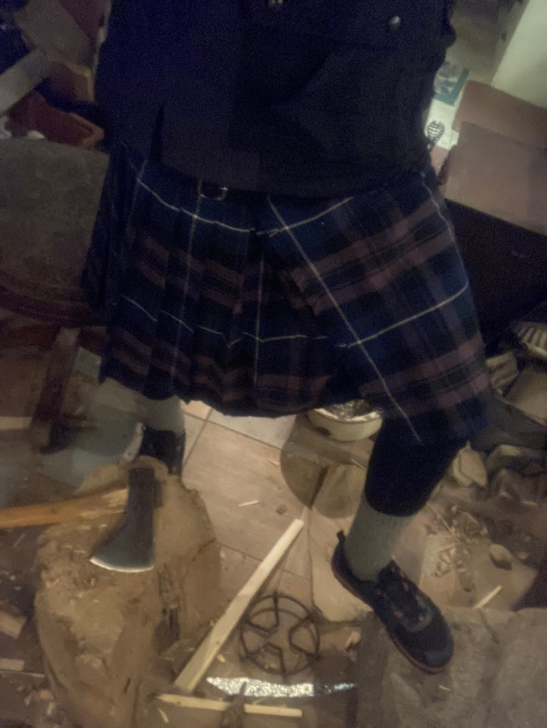 Today I went out (in different boots but still in kilt, the photo is from Monday) and swept up many of the crumbs before a monster load of timely freight. Casual 12 hour day…