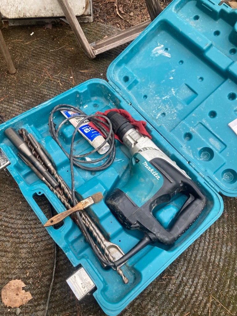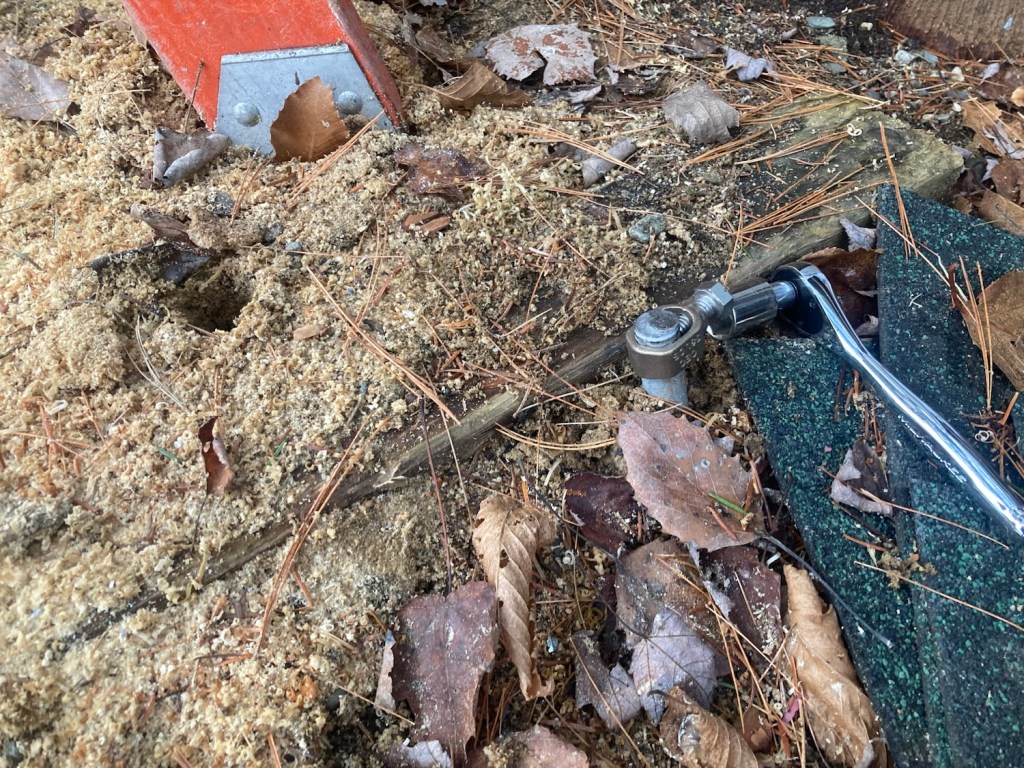 After being denied once (the grounding bar just STOPPED going down about halfway, some four feet) as evidenced by the hole on the left, the second shot went to the hilt. The grounding wire clamp is in place. It’s 20 feet from the house, just need grounding wire to connect it. In the event of a surge, it draws the excess power away from the breaker box, wiring, house and grounds it, literally.