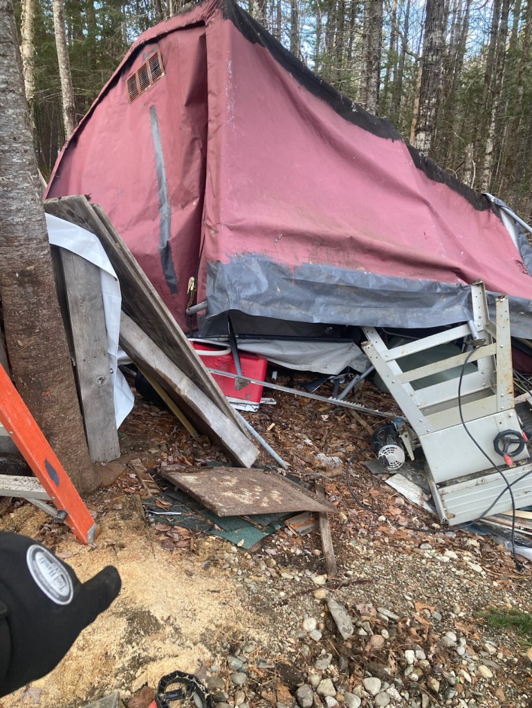 For perspective, the gloved hand in the lower left indicates the second ground, and how mangled the Downy shed is, that up ended the table saw. I was looking at some marks it made on its way to the woods and I’m glad Wellington was up wind, barely, but enough. Nary a scratch…
