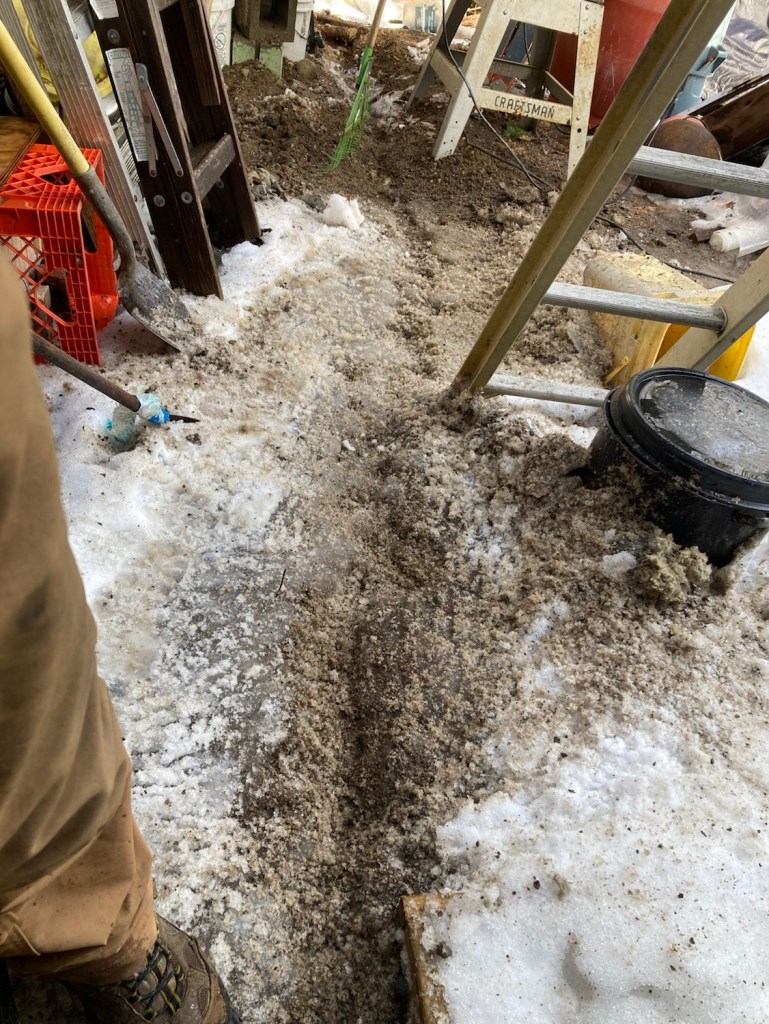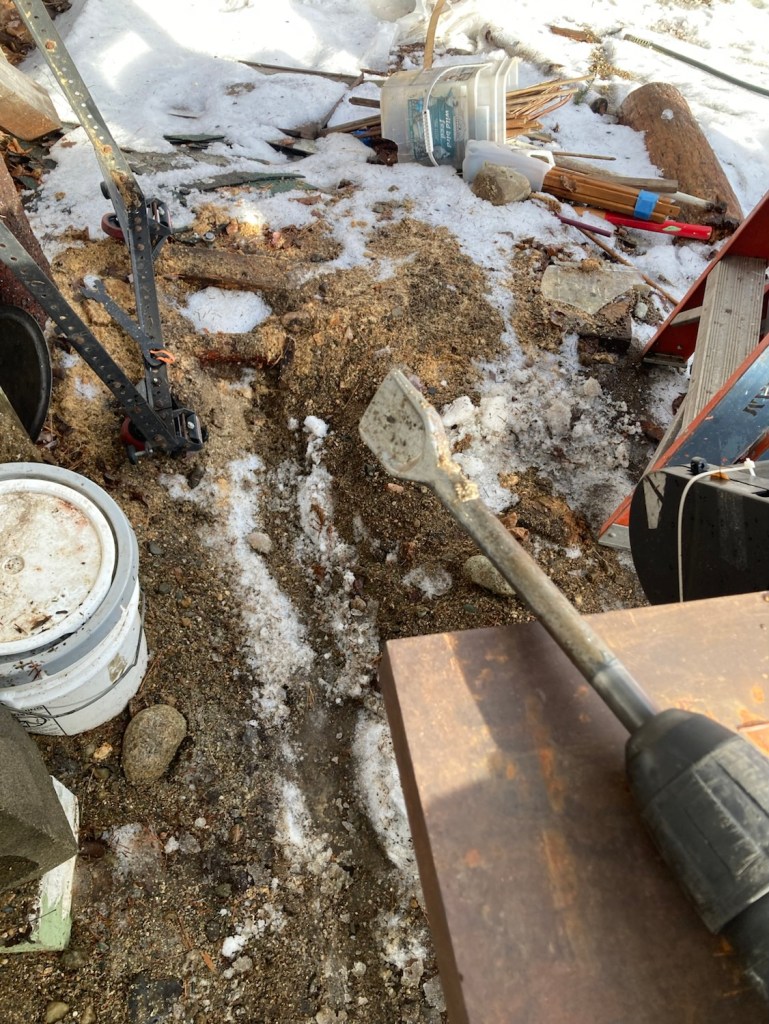 Your favorite and mine, the demo-hammer comes out of the box to help loosen up some ice and sand. It may be above freezing but in the shade things are slow to soften.