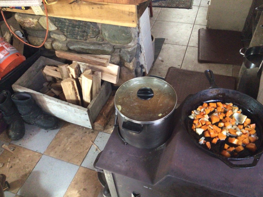 Of wood heating (and the applicable stove) is cooking. I’ve had a chicken stock going for DAYS and it’s remarkable! It adds fragrance and moisture to the air, and warm wet nutrition to me. Softening up some squash for my noodle bowl lunch, of which the noodles will cooked IN stock.