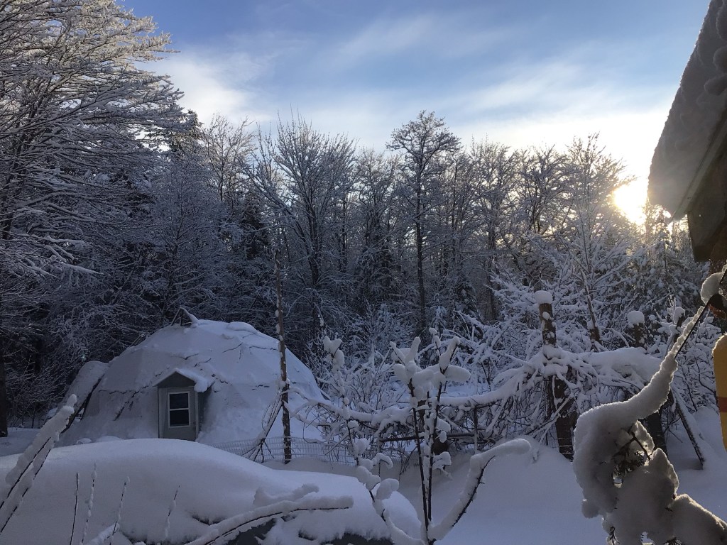 The grome isn’t blanketed because the snow was heavy enough to shed in increments. First time this season. It has a good insulative (made up word!) around it. The next couple days of sun will clear the top and continue the warming trend inside.