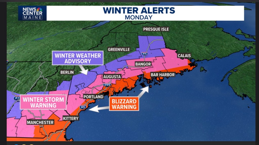 The “blizzard warning” has come to include the entire coast of Maine. That doesn’t necessarily mean more snow, but an increase in predicted wind speeds. The snow is forecasted to be heavy, both in projected density while falling (like whiteout) and moisture content.