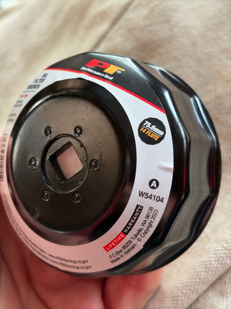 Removes the oil filter housing. It’s a curious setup, the housing being in two parts, the filter itself has no cover.