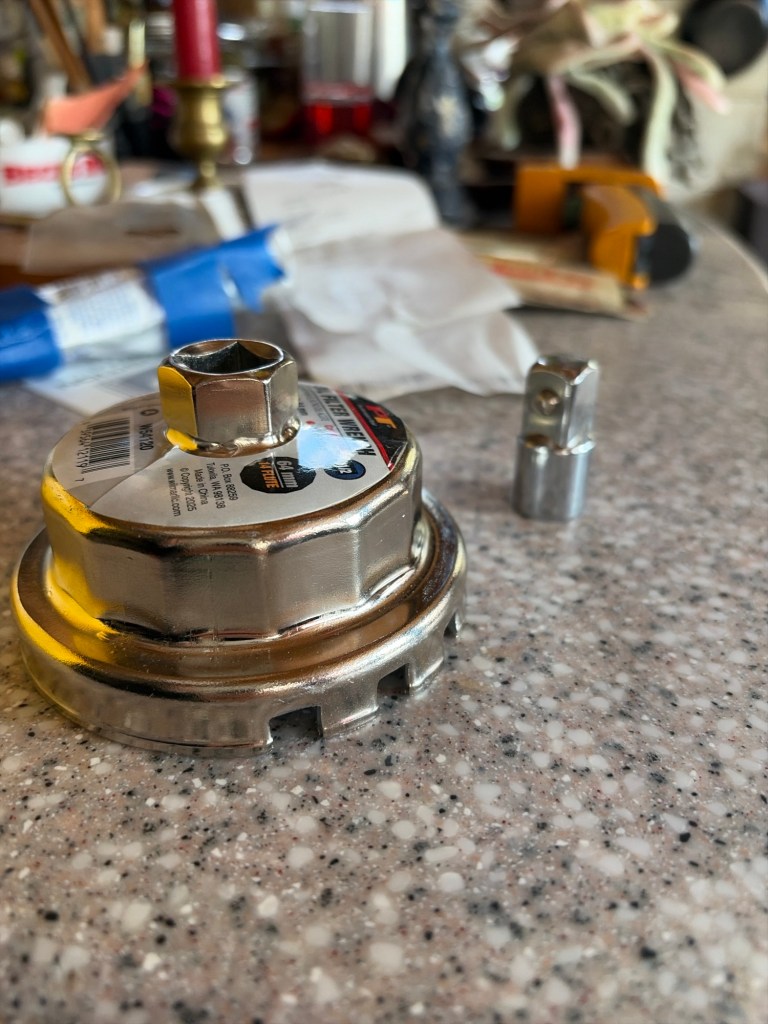 This chromed up snazz-ma-doodle is apparently the proper oil filter housing removal tool. I’m unable to verify that fact as W3LLY is sitting near the East Machias line (of Whiting) at Prescott’s Garage (I know, isn’t it absolutely delightful?!) waiting for new sneakers, and likely brake pads.