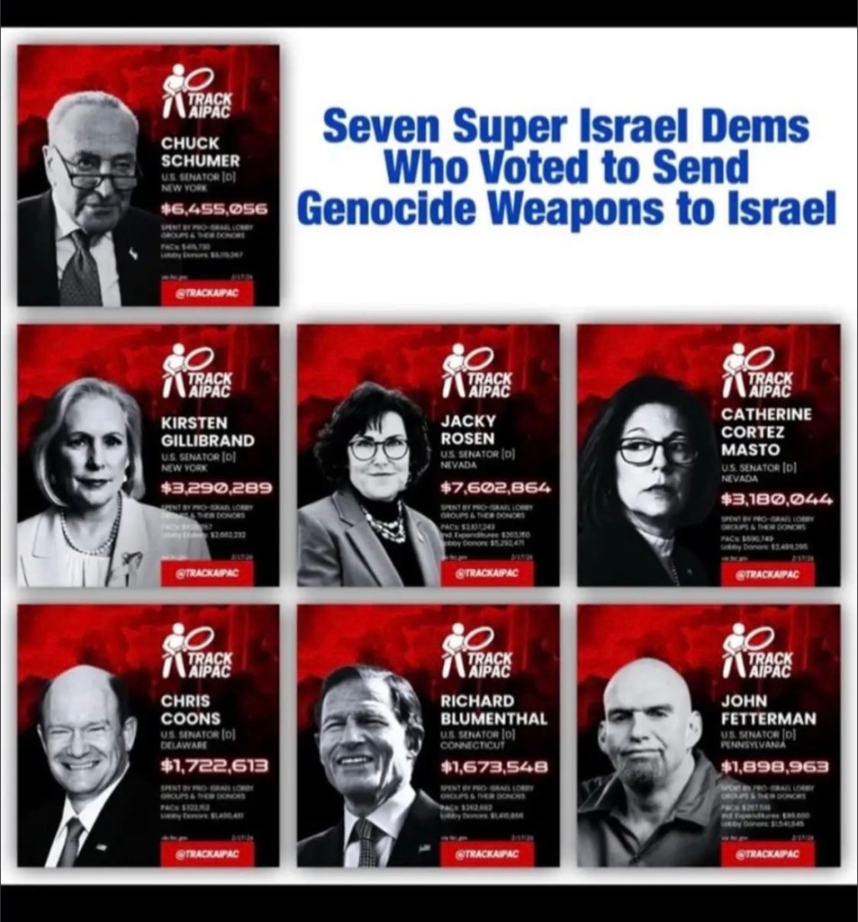 The above Americans voted to NOT suspend sending arms to another country for continued genocide. Hopefully you can guess which one. If not, it’s time you learned about AIPAC, the billion dollar industry influencing our government to support a different one…